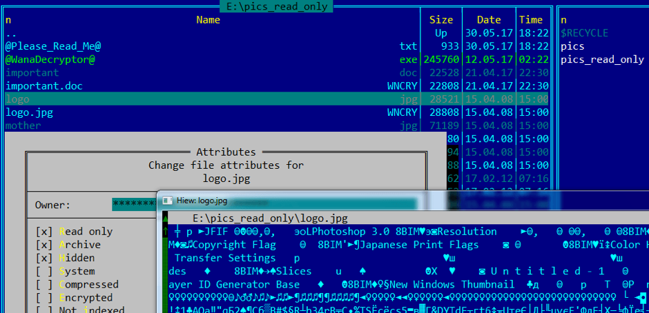 实际上,几乎很少有恶意软件能够直接加密或修改只读文件,而WannaCry同样是如此。WannaCry首先会拷贝目标文件,然后再对文件副本进行加密。但需要注意的是,此时原始文件仍然没变,只是被添加了一个“隐藏”属性而已,因此用户只需要调整这些文件的属性即可完成文件恢复。