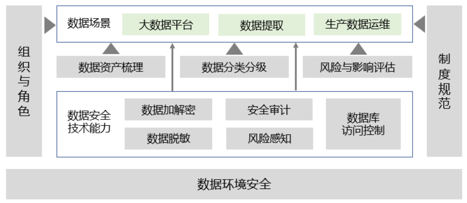 根据银行业的数据应用状况及数据安全管控现状,单点防护的方式越来越不能满足数据安全需求,数据安全体系从组织角色、资产梳理、数据分类分级、资产风险与影响评估、制度规范、技术能力六个方面进行建设,可以整体提升数据安全防护水平。