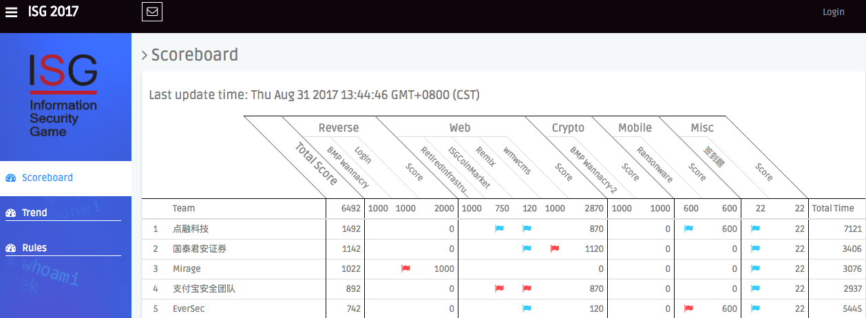 从哪题入手得分是很重要的策略,但是像点融科技,一步一个脚印,稳稳的凭借夺旗总数走上第一的,着实是一种值得学习的心态