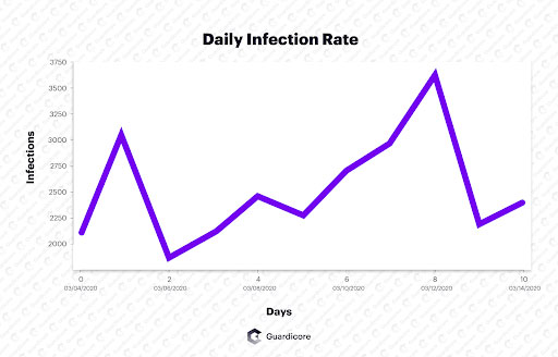 值得注意的是,61% 的计算机仅感染了 2 天或更短的时间,21% 的计算机感染了 7-14 天以上,其中 17.1% 的计算机受到了重复感染。后一种情况可能是由于缺乏适当的安全措施而导致在首次感染服务器时无法彻底消除该恶意软件。