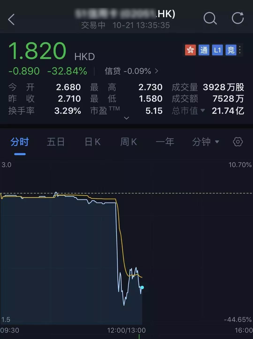 上述消息在午间发酵,当天下午港股开盘后,该公司股价随之闪崩,一度暴跌超40%,股价最低去到1.58港元/股,为上市新低。随后跌幅略有收窄,至下午1时50分,该公司宣布股票暂时停牌,停牌前报1.77港元,跌34.32%。