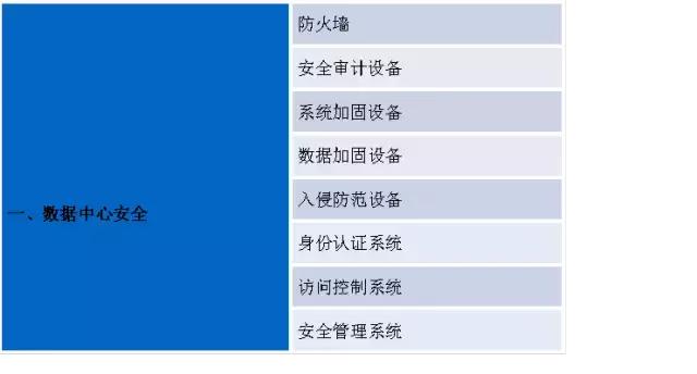 《标准与规范》专门提到了“数据中心安全”,细分为防火墙 、安全审计设备、系统加固设备、数据加固设备 、入侵防范设备 、身份认证系统、访问控制系统 、安全管理系统。