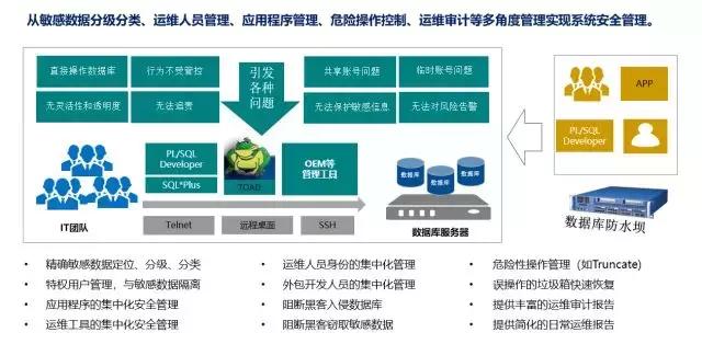 美创通过建立三权分立、敏感数据分级分类,管好运维人员、员工客户、黑客三类人,构建由内而外的敏感数据纵深防御体系。美创数据库防水坝从数据库准入、应用变更和部署、危险操作控制、敏感数据保护、误操作防御、误操作恢复、运维审计、工作报表等方面全方位支持数据库运维安全管理,满足运维安全内部控制和各类法规法令(等级保护、SOX、PCI、企业内控条例等)的要求。