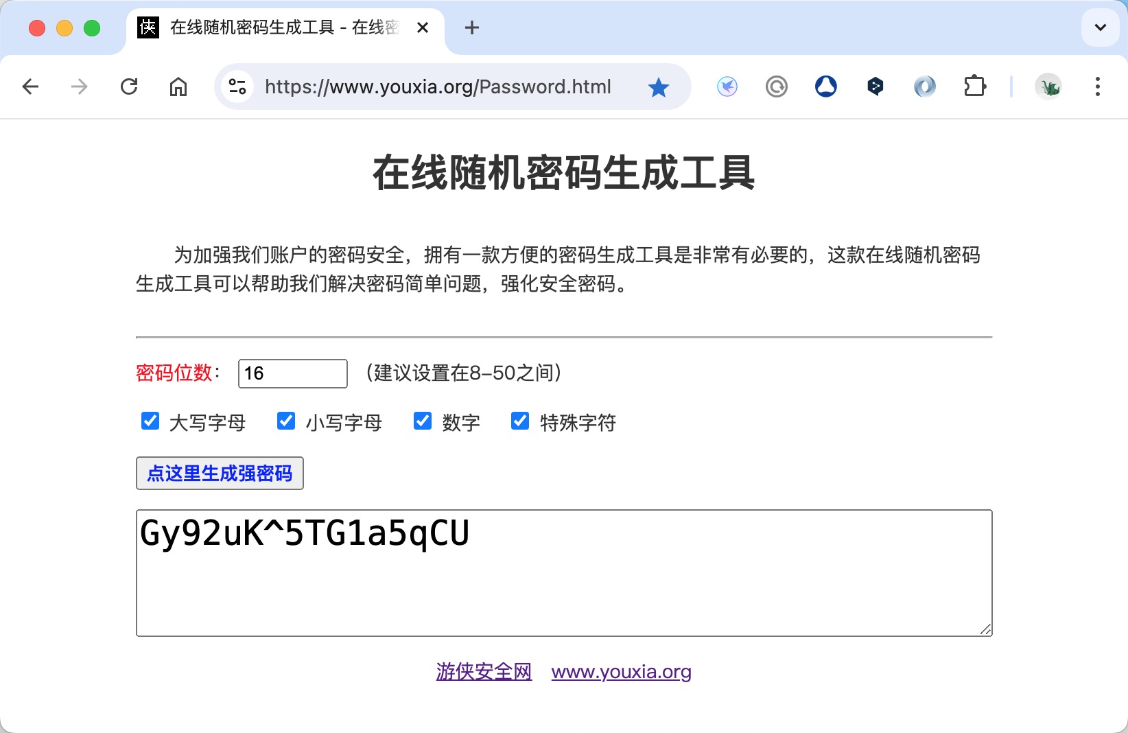 游侠安全网:为了降低弱口令给大家带来的安全风险,我站为大家准备了一个在线密码生成器,可以直接生成符合密码复杂程度的密码,欢迎大家使用!