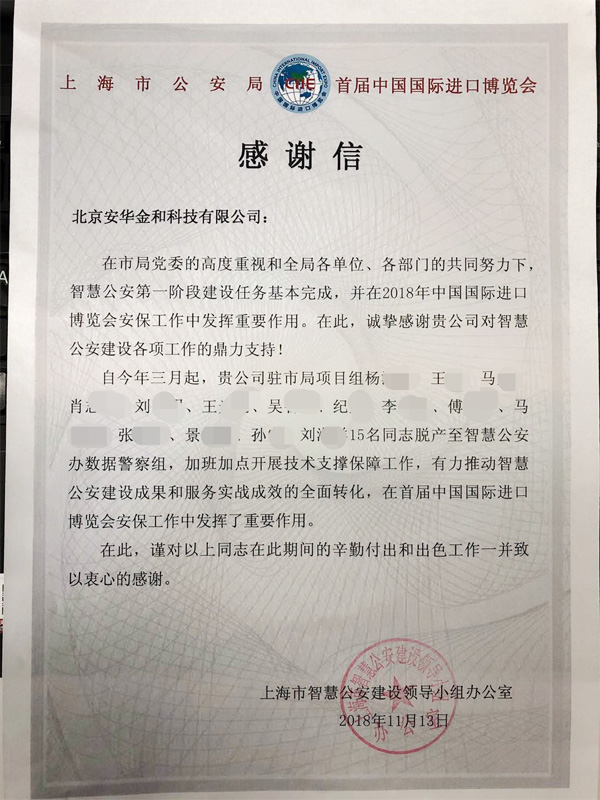 正因为此上海公安&首届中国国际进口博览会特向安华金和发来了感谢信,信上表达了对安华金和项目支撑的感谢。带着这份感谢,我们会继续在智慧公安的项目中发光发热。