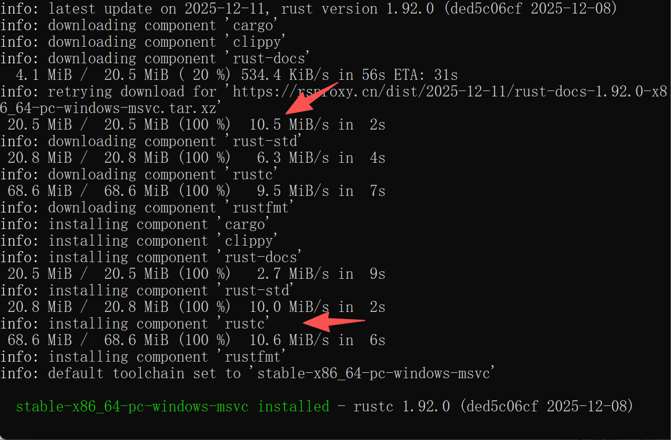 之后,重新执行 rustup-init.exe ,直接从KB跳到了MB!