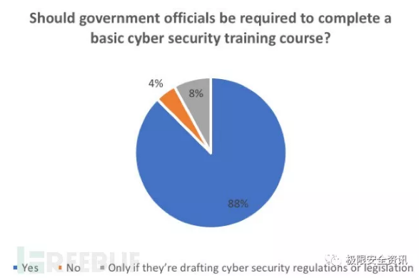 从结果来看,有88%的人认为政府官员需要完成基础的网络安全培训课程。还有8%的人认为,除非他们参与制定网络安全相关的法律法规时,才有必要具备一定的网络安全知识。