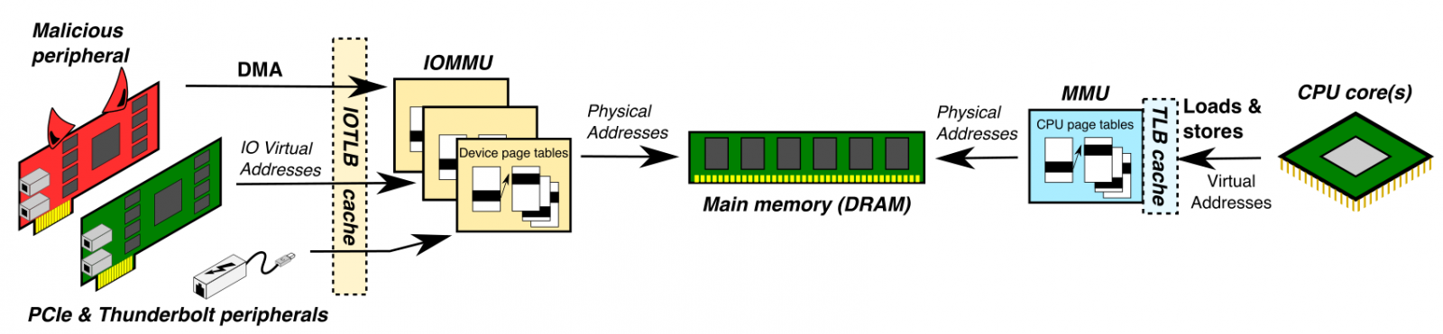 相关论文发表在加利福尼亚州圣地亚哥举行的网络和分布式系统安全研讨会上。它描述了macos、freebsd和linux中的一组漏洞,这些漏洞名义上利用iommus来抵御DMA攻击者。该问题与Thunderbolt启用的直接内存访问有关,现有IOMMU保护系统未正确阻止该问题。