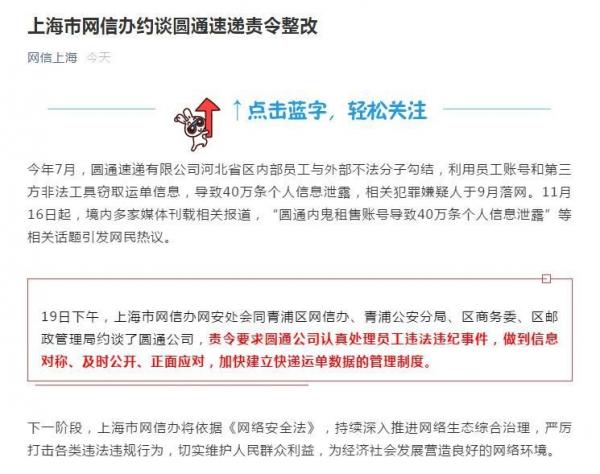 19日下午,上海市网信办网安处会同青浦区网信办、青浦公安分局、区商务委、区邮政管理局约谈了圆通公司,责令要求圆通公司认真处理员工违法违纪事件,做到信息对称、及时公开、正面应对,加快建立快递运单数据的管理制度。