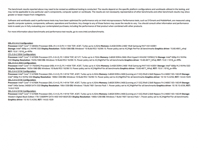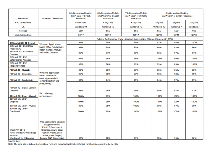 第七代Kaby Lake-H高性能移动平台受到的影响,与第八代平台相似(在SYSMark2014SE基准测试中大约为7%)。