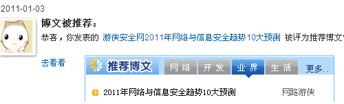 游侠的《2011年网络与信息安全行业10大预测》被51CTO博客频道评为“推荐博文”。
