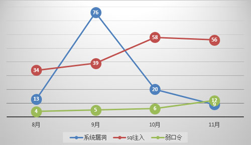11月平台SQL注入漏洞占主要比重安华金和数据库攻防实验室统计了8月到11月,4个月间最具代表性的三种漏洞类型的变化趋势(系统漏洞、SQL注入、弱口令)。可以看到SQL注入漏洞数量长期占据高位。