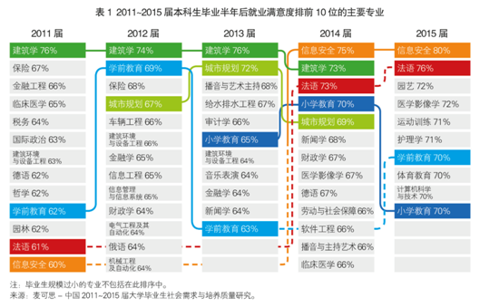哪些专业的毕业生就业“幸福感”最强,近五年又呈怎样的变化趋势?针对2011~2015届毕业生就业量前120位的专业,进行的就业满意度调查显示,信息安全专业连续两年满意度最高,小学/幼儿教育,法语、德语等小语种专业多年就业满意度榜上有名。