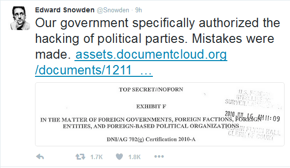 摘要: 据俄罗斯“卫星”新闻网7月26日报道,美国中情局前雇员爱德华·斯诺登在自己的推特上表示,美国政府曾批准对国外政党实施网络攻击。 为证实自己的话,斯诺登附上了一份日期为2010年7月16日的文件。文件标注了“绝密”字样,并具体列出了涉及的国家、国际组织、国外政...