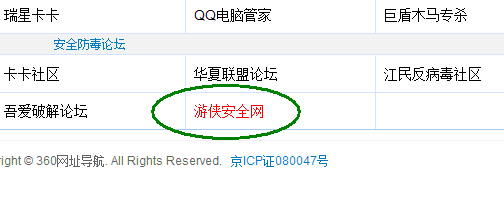 摘要: 2012年8月22日,国内知名导航网站“360安全网址导航”正式收录“游侠安全网”(www.youxia.org),这也代表着本站开始得到大型网址导航站的认可。收录页面为“杀毒防毒”大类: http://hao.360.cn/shadufangdu.htm...