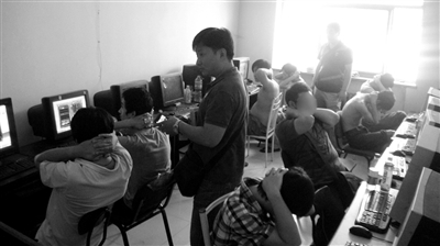 每台电脑边都有一名男青年盯着屏幕忙碌着,屏幕上无一例外显示着同一网游界面,有些同时登录了两三个游戏账户。