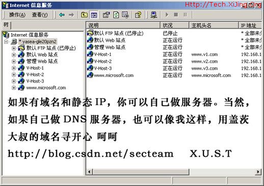“那么我们怎么才能浏览ASP的网站呢?微软给了我们简单易行的方案——用IIS做WEB服务器,默认的就支持ASP,大家可以在控制面板的‘添加/删除程序’里面选择‘添加/删除Windows组件’,然后在‘Internet信息服务’那里选择,下一步知道完成就好了。完成之后,去‘程序-管理工具-Internet服务管理器’,一般的我们在本地测试可以选择‘默认WEB站点’,当然也可以自己新建一个站点。下面的是IIS的主界面: