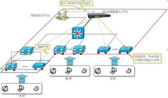 1.计算机接入管理:借助网络准入系统,明确了网络边界,外来计算机随意插拔网线的非法接入将被立即隔离,并在平台上生成报警,帮助管理者有效定位潜在的非法接入安全漏洞,发生非法“统方”、非法内部入侵安全事件的概率大大降低。