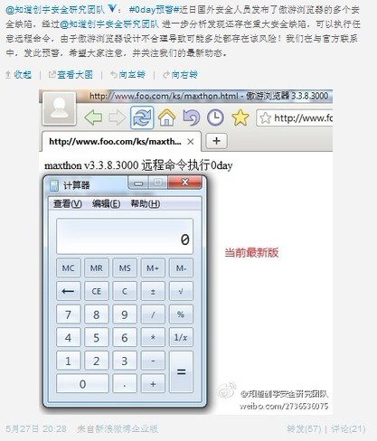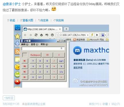 不过第二天,知道创宇官方微博再次宣称,傲游浏览器新版本中0day漏洞仍未完美解决。漏洞修复仍然存在缺陷,通过一定的方式可以绕过,同时知道创宇在微博中公布了绕过最新版本的截图。如图2所示: