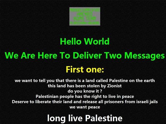 黑客在被黑的每个网站都留下了“MissionComplete”和“巴勒斯坦万岁”的字样,以及1946年至2000年的巴勒斯坦领土损失过程的示意图。