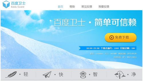 版面非常简洁,一如标题所言——百度卫士·“简单”可信赖。页面没有什么多余的内容,并且可以看到,下载时间为18:00-23:39,且只有1000个下载名额, 很遗憾,当各位看到本文的时候,名额已经木有了……木有了……
