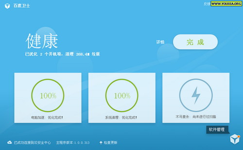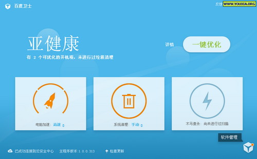 界面也非常简洁, “电脑加速”、“系统清理”、“木马查杀”三个大功能,另外还有个“软件管理”。