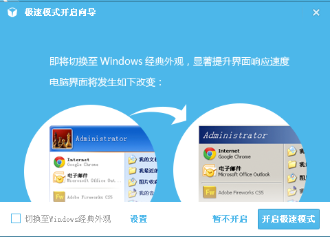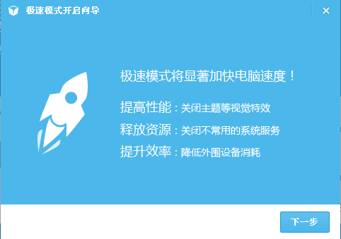 另外,如果将鼠标点“电脑加速”,则会出现一个简短的提示,采用极速模式加快电脑速度。