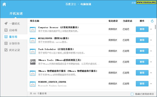 服务项,就是Windows的“服务”咯,没什么好说的,不建议新手操作,否则容易导致各种奇形怪状的问题……按照百度卫士提示的就行了。