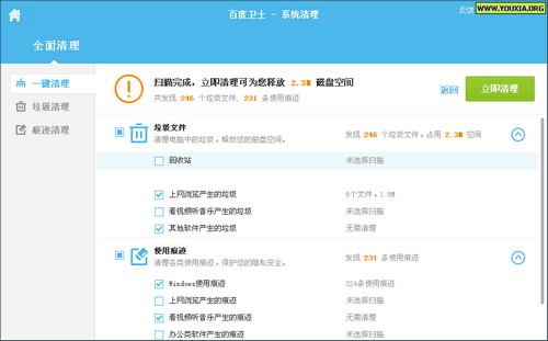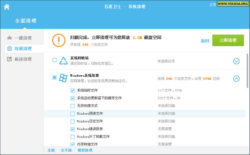 系统清理项的“一键清理”,其实和360安全卫士、金山卫士差异不大,比较简洁,只需要“立即清理”即可。