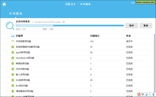 查杀下木马吧,选“闪电查杀”,速度也比较快,在这个512M内存的XP系统下,大概用了不到2分钟,还算是不错的速度。