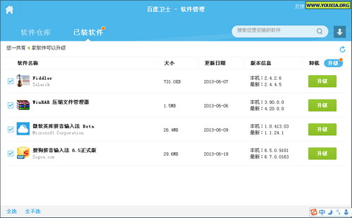 已装软件管理,可以直接升级老版本的软件。