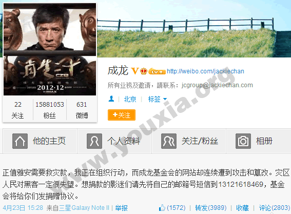 摘要: 游侠安全网(www.youxia.org)从成龙的新浪微博获悉:成龙基金会网站连续遭到黑客攻击,并对网站信息进行了篡改(疑捐款帐号被篡改),因此成龙在谴责黑客的同时,也提出了另一个办法:邮箱发到13121618469,之后成龙基金会将会发捐赠协议。游侠安全...