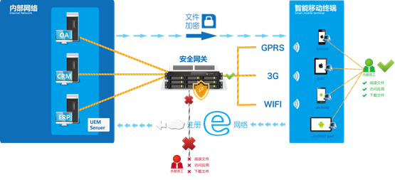 由于智能终端用户随便访问企业内部应用服务器,企业用户面临内部接入风险。智能终端极易丢失,存储其上的企业文件将面临泄密风险。员工如何才能方便、快捷、高效、安全地阅读存放在智能终端上的文件?企业如何在智能办公的同时保证安全?