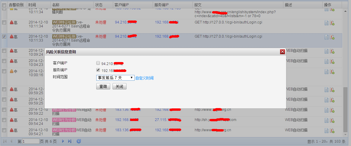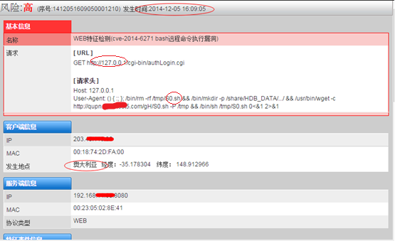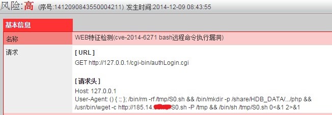 日前,安恒信息在某政府机构网络中部署的APT产品监控到了多次“CVE-2014-6271 bash远程命令执行漏洞”告警,攻击源来自意大利、台北、奥地利、挪威、希腊、澳大利亚等多个国家,且请求报文中的Host值为“127.0.0.1”,初步判断为一起利用僵尸网络发起的“恶意攻击”。