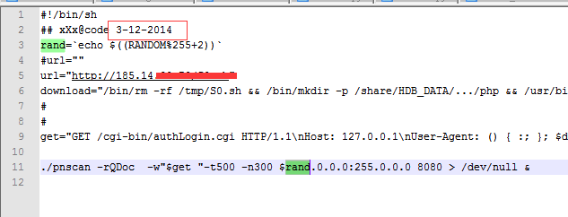 这个run脚本主要作用是下载叫pnscan的恶意程序,它主要是扫描程序,从调用参数可以看见它是全网段扫描的,实现对更多的主机进行攻击。另外按照bash漏洞出来的时间可以推测出这个脚本是2014-12-3日编写。
