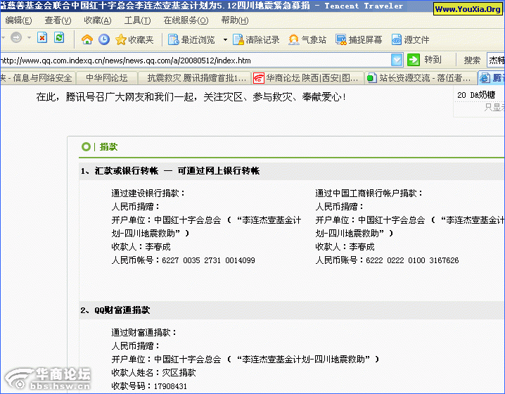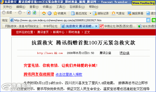 摘要: 现在的有这样几种: 1、短信,说地震了,东西没了,汇款 2、做假网站,利用网友的爱心行骗,大家一定看清楚! 建议捐款的时候到门户网站,不要直接点网上的链接。防止爱心被拐卖! 这个图,看到了,是腾讯的吗?——不是!看清楚,域名是 indexq.cn !!...