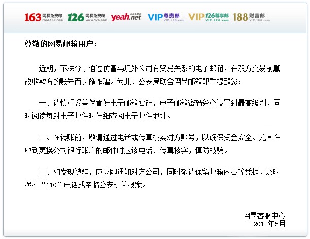 针对外贸网站进行诈骗的案件日益增多,今天一早游侠打开信箱就看到了《公安局联合网易邮箱提醒广大用户防范诈骗邮件》,全文如下:
