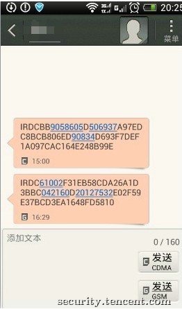 下面就是在系统自带的短信程序里看到的加密后的内容(传输中如果被人截获,他就只能看到这一串没有意义的字符串):