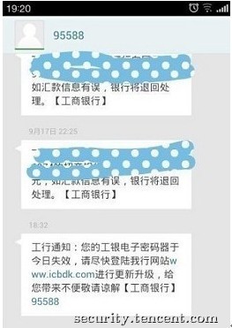 下图是伪基站发出的伪造的工行号码95588的诈骗短信: