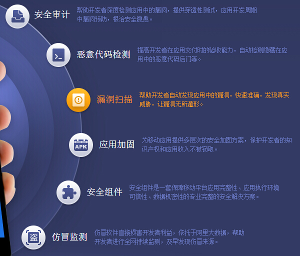 阿里移动安全中心负责人表示,阿里巴巴将全面开放积累多年的安全技术体系,通过这两款重量级产品的相互配合,从应用开发源头便提供安全防护,直至贯穿移动端用户使用手机、参与网购及在线支付的每个环节。负责人特别强调,阿里巴巴并非在做一款单纯的安全类软件,而是要着力打造从用户到合作伙伴,再到开发者的移动安全生态圈。
