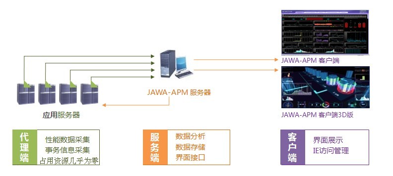 JAWA APM 架构如图1 所示,由代理端,客户端和服务端组成。