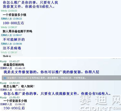 受害者加病毒作者的QQ聊天,结果会被对方勒索100-800元。不愿意给钱的还被要求一起参与推广病毒才管修复文档。