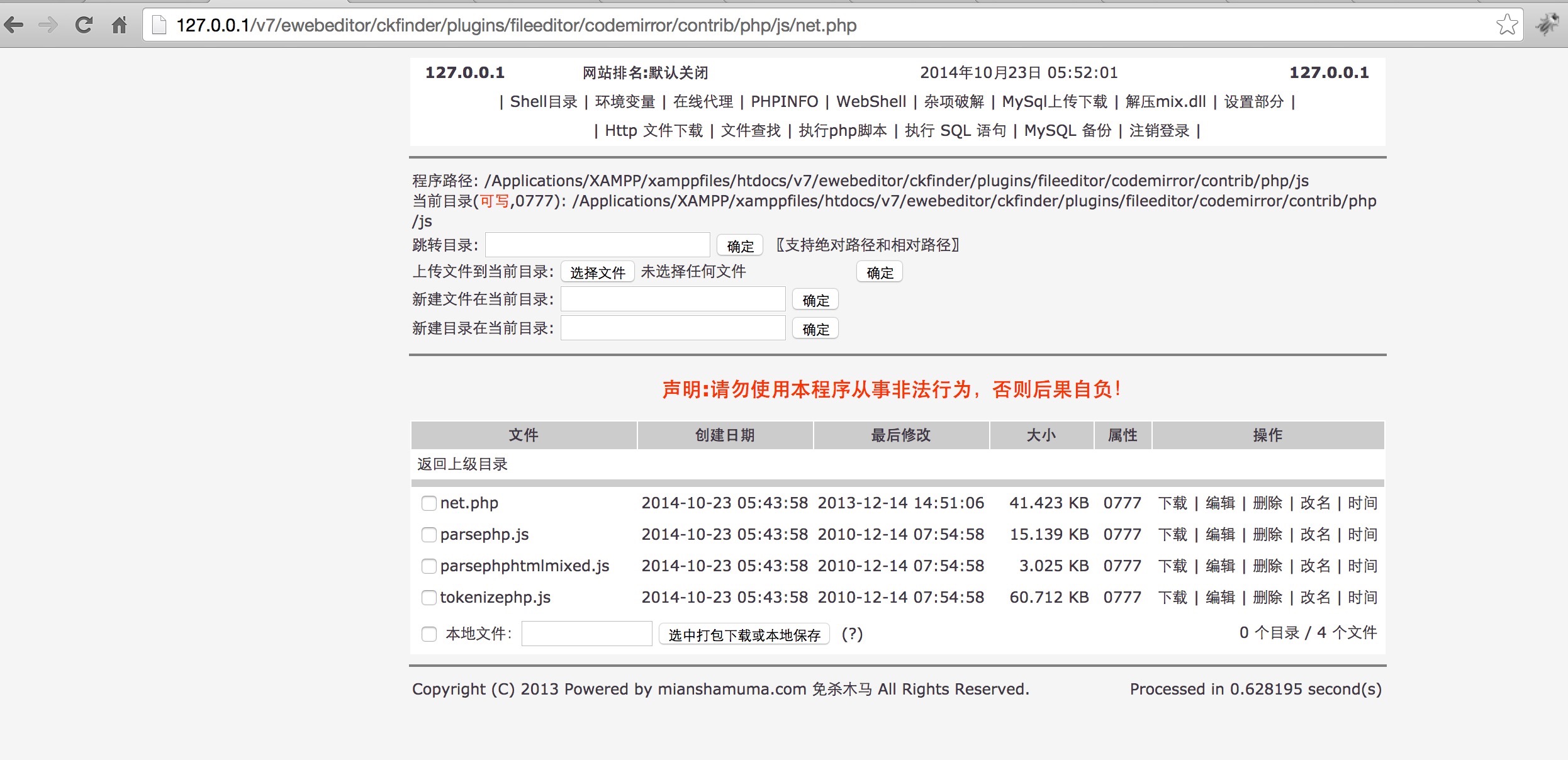 2、植入php木马后门文件:/ewebeditor/ckfinder/plugins/fileeditor/codemirror/contrib/php/js/net.php