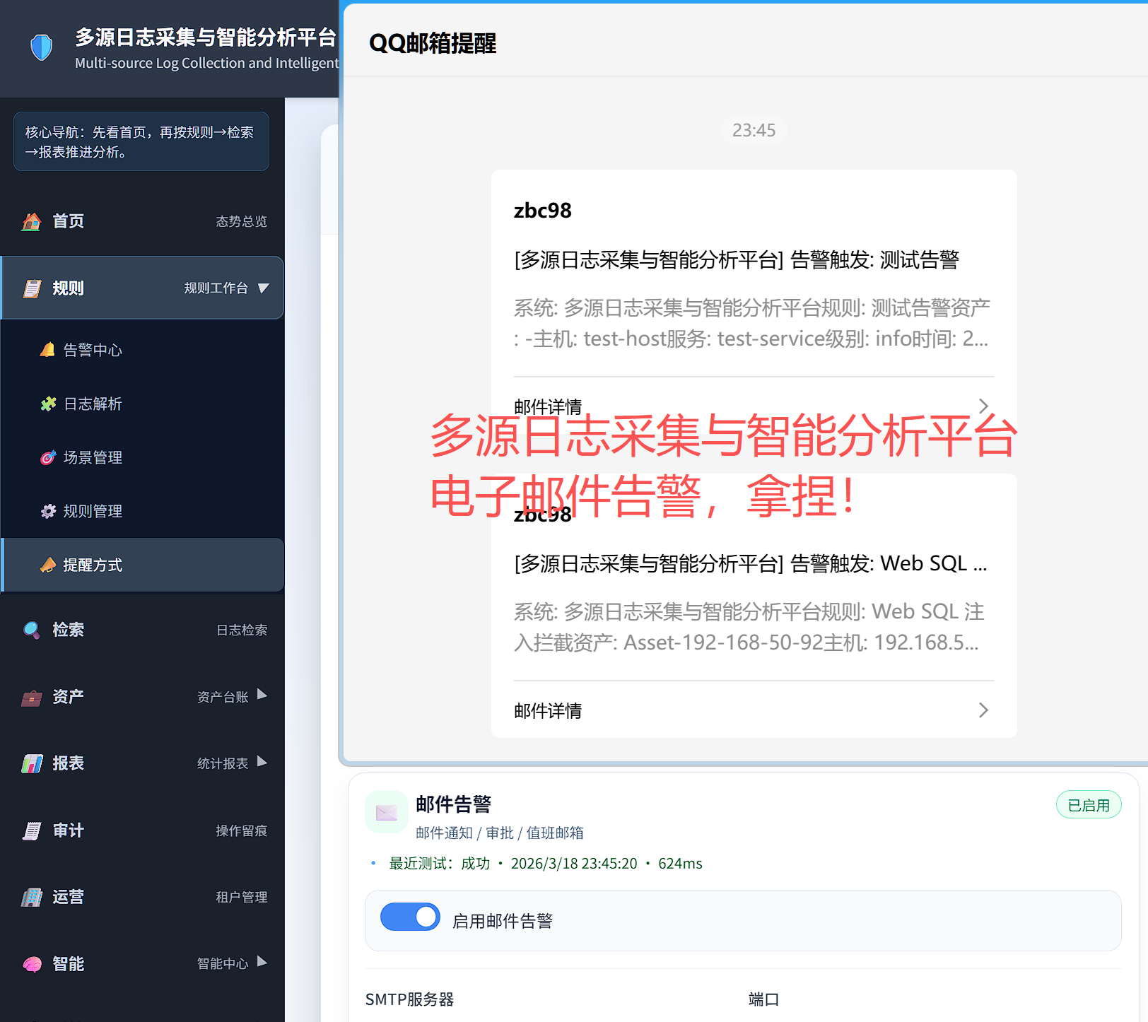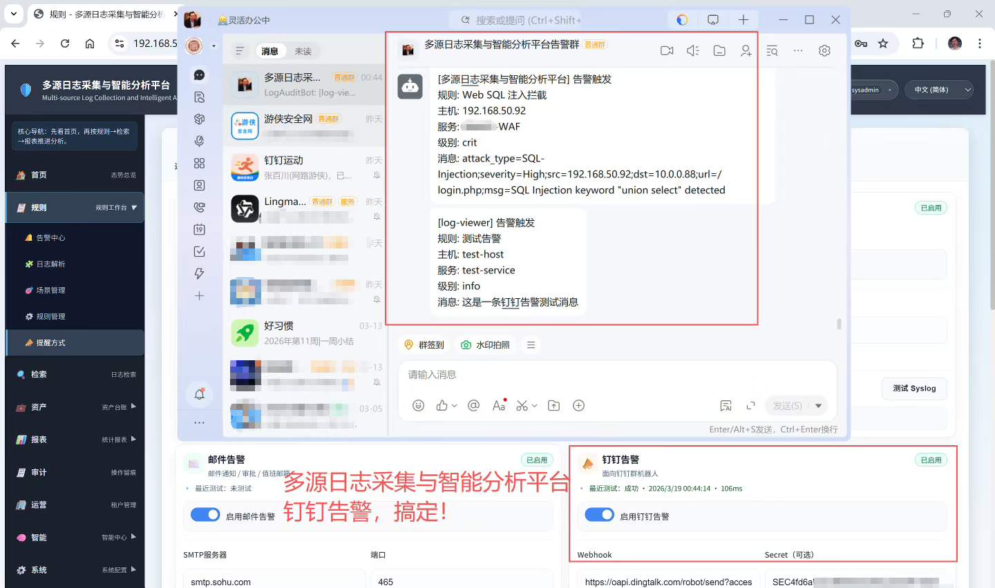 日志审计平台已实现邮箱告警与钉钉Bot告警覆盖,只要钉钉配置好,随时可以收到弹窗告警啦!