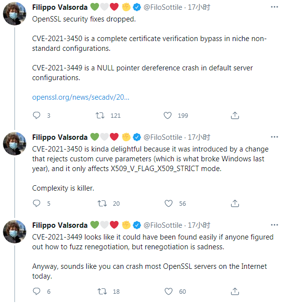 此外 OpenSSL 还修复了一个可能在极端情况下发生的 CVE-2021-3450 漏洞,以阻止应用程序检测、和拒绝未由浏览器信任的证书颁发机构签名的 TLS 证书。