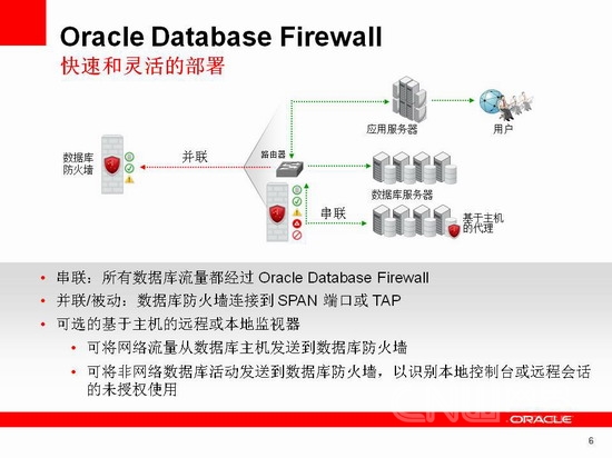Oracle数据库防火墙简单、易部署,不需要对现有应用、数据库基础设施或目标数据库的现用操作系统进行任何调整,它可在网络上在线部署,既可采用禁止与监控模式,也可采用仅监控的系统外模式。
