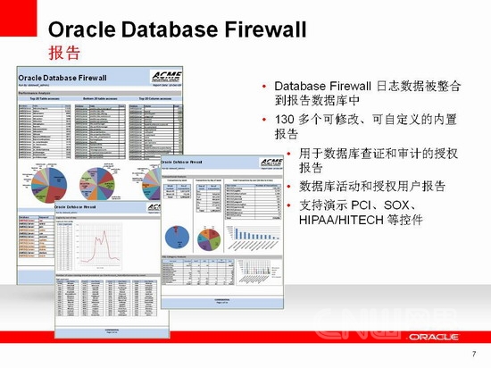 Oracle数据库防火墙可在基于英特尔处理器的硬件上运行,并能轻松进行扩展,以支持大量数据库服务器。它配备了很多预置和可定制的报告,有助于企业满足各种隐私和管制法令要求,如支付卡行业(PCI)数据库安全标准(DSS)、美国萨班法案(SOX)和美国HIPAA法案。