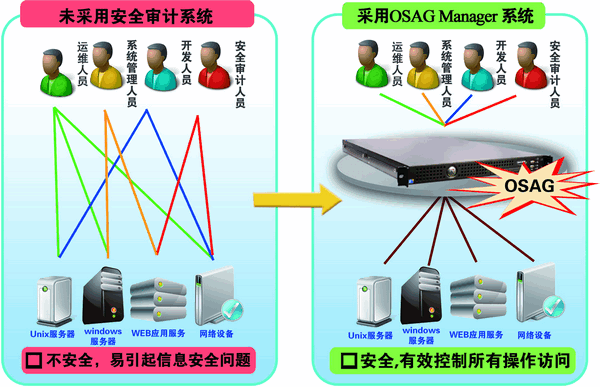 部署天锐锋OSAG Manager后,通过使用锐锋OSAG Manager对设备的密码进行集中管理,设备密码只由IT主管或专人管理,并存储在锐锋OSAG Manager中,其他人员不再掌握设备密码。